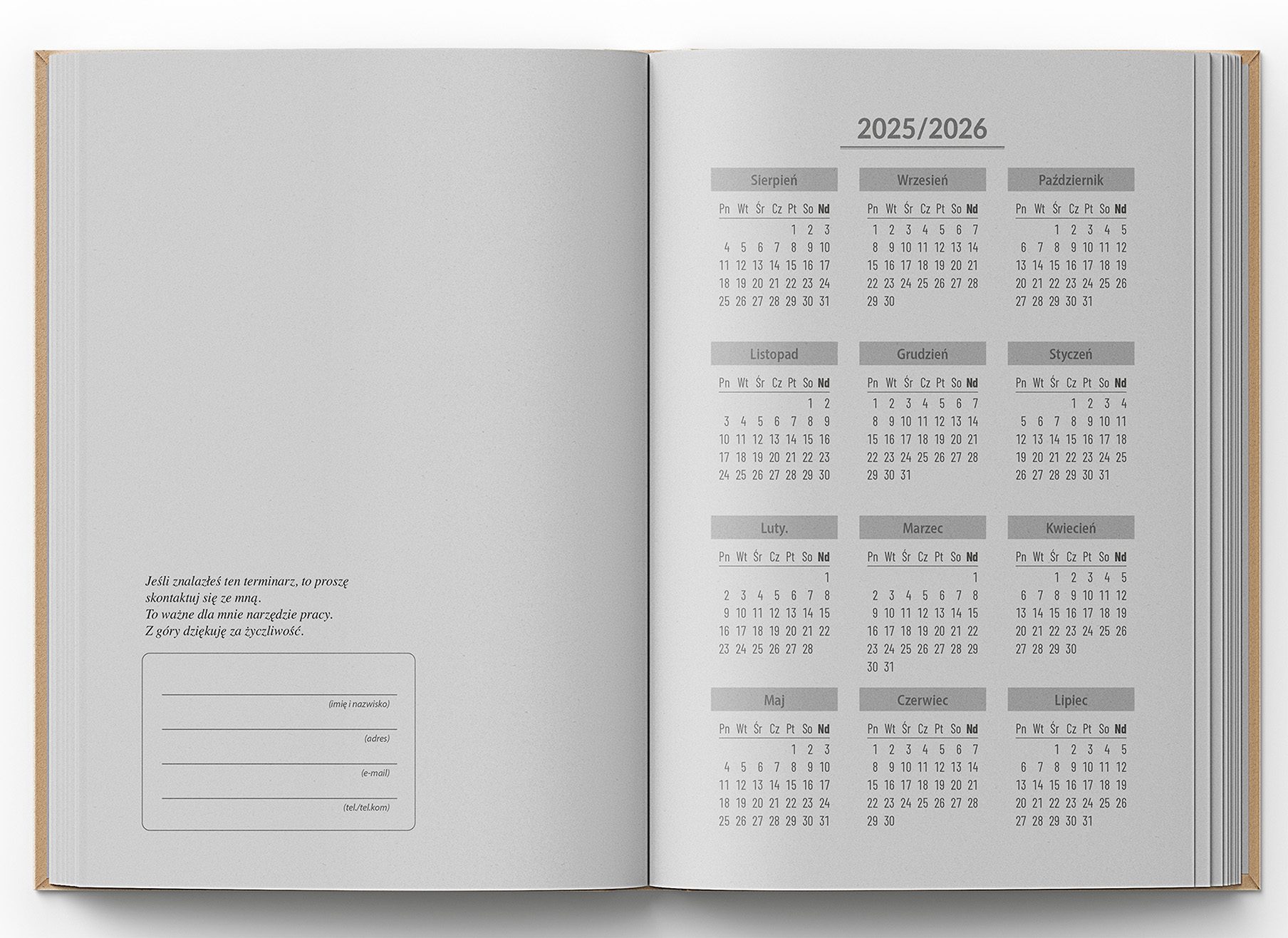 • Rozpoczęcie kalendarza: dowolny miesiąc – wybierasz przy zamówieniu