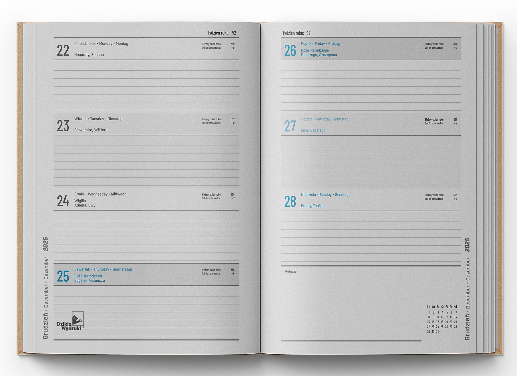- Kolorystyka kalendarium: dwukolorowa (niebieski + czarny)